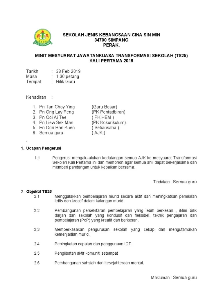Sekolah kebangsaan paya panjang, muar, johor. Untuk anda mahu mendapatkan contoh format minit mesyuarat terkini 2022 sekolah tahun ini dengan cara penulisan terbaru, download sekarang. Minit mesyuarat jawatankuasa transformasi sekolah 2025 ts25 bil 1 / 2020 tarikh : 087334494 89008 keningau, sabah faks :